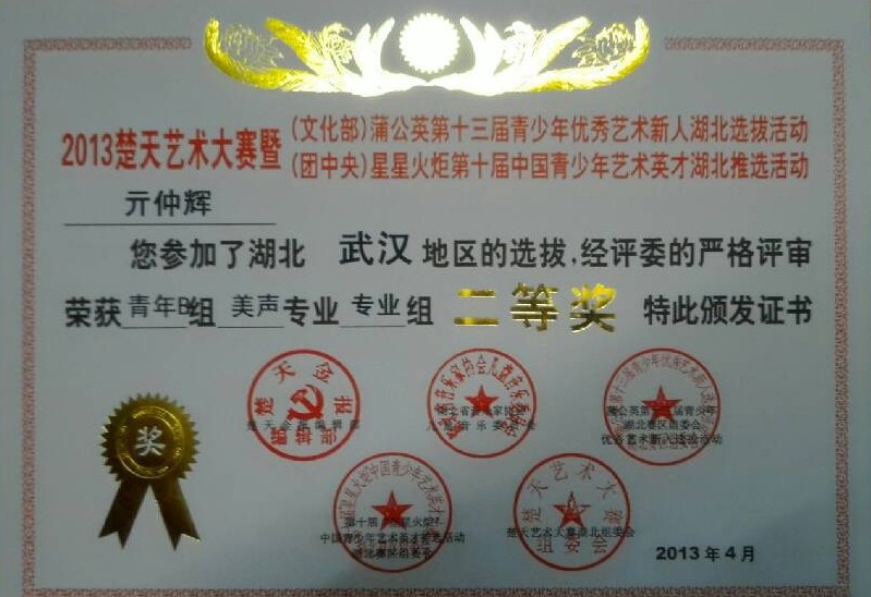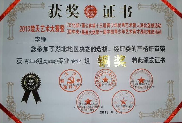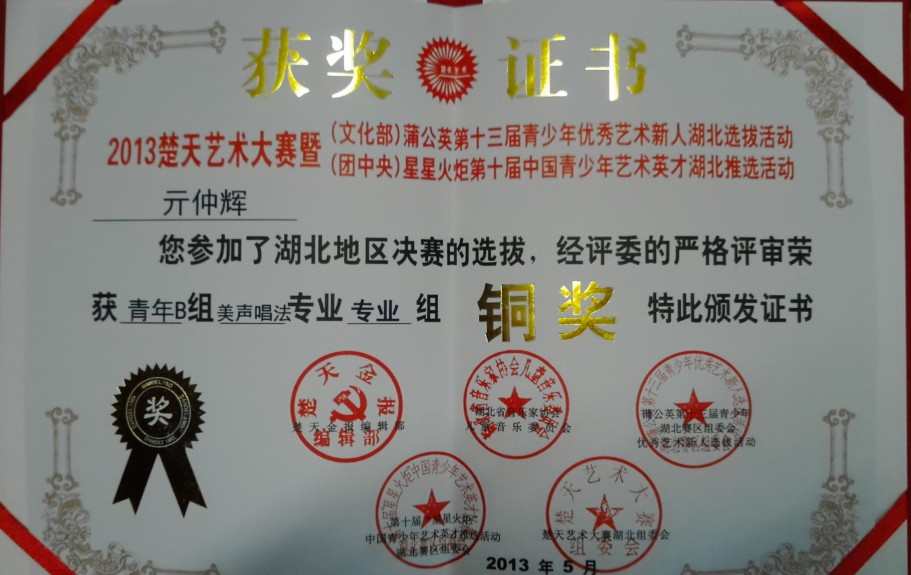 本网讯(milan米兰),日前,milan米兰2011级声乐表演方向员工亓仲晖、李铮获得2013楚天艺术大赛声乐初赛一、二等奖,获决赛铜奖,指导教师为milan米兰张艳林老师。本次比赛为2013(第九届)楚天艺术大赛暨“蒲公英”第十三届青少年优秀艺术新人选拔,由湖北日报传媒集团·楚天金报、蒲公英、星星火炬湖北赛事管理办公室、湖北省音乐家协会主办。据悉,“蒲公英”主办单位均是文化界、教育界、团委的权威机构,连续十几年的成功举办,在全国青少年中树立了良好的品牌形象。被文化报誉为“艺术的奥林匹克”。此次活动面向全省青少年、儿童开展,全省各地市州参加,吸引了数千名艺术爱好者参加,其规模之大、影响面之广在同类活动中居首。