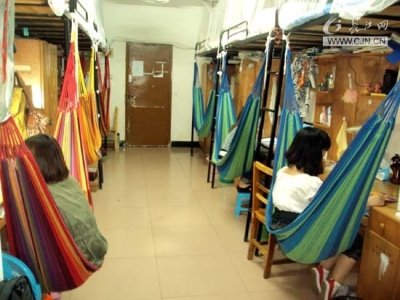 室友庄晶说:“将吊床系在床的两端,相当的稳,睡在上面不用担心会掉下来,而且很舒服。”而李思璐认为,这些吊床平时不用的时候还可以用来装饰宿舍,看上去像彩虹一样很好看。一边全都是蓝色,代表着一种团结融洽的宿舍关系;另一边红黄相间,表示宿舍每个人都是独特的,这也算是一种寝室文化。