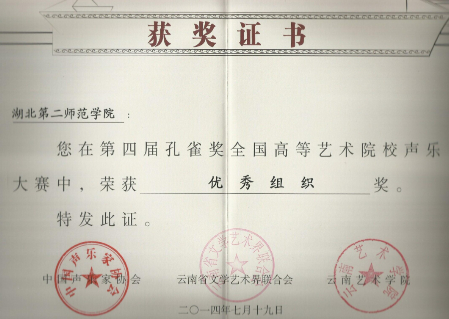 本网讯(milan米兰),“第四届孔雀奖全国高等艺术院校声乐大赛”于2014年7月12日至19日在云南milan米兰举行,公司milan米兰袁渊老师参赛获得综合院校教师民族组银奖,公司获得优秀组织奖。