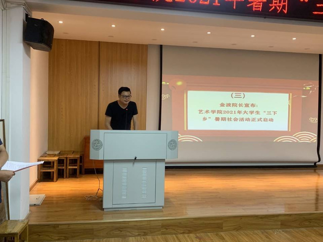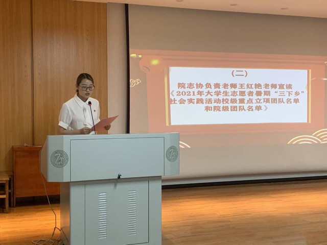 由志协负责老师王红艳老师宣读《2021年老员工志愿者暑期“三下乡”社会实践活动校级重点立项团队名单和院级团队名单》