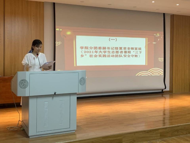 由学院分团委副书记骆夏君老师宣读《2021年老员工志愿者暑期“三下乡”社会实践活动方案和团队安全守则》
