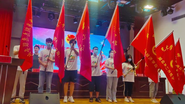 与会领导为“希望家园”志愿服务队授旗,各志愿服务队代表上台接旗。