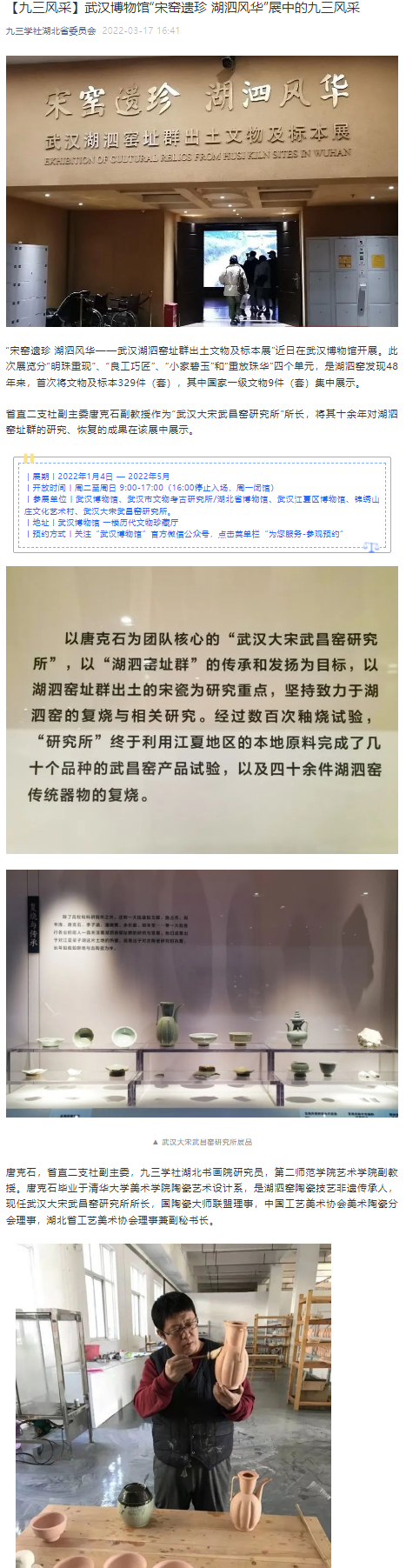 本网讯(通讯员:唐克石)近日,九三学社湖北省委员会官微报道了,milan米兰动画专业负责人,唐克石副教授团队研究成果在武汉博物馆展出事迹。后期,动画专业的信息化美育团队将运用扩展现实技术,把“武汉大宋武昌窑研究所”的成果,转换成学校美育课程中优秀传统文化的特色内容推送给员工。