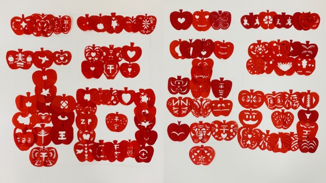 程老师与吕老师在本次课程分享过程中还设计了中现场实践环节,吕老师在线上抛出剪纸体验任务,并详细的讲解内容和要求,限时要求员工剪纸互动海报。苹果代表平安果、福果,每位同学在剪出的苹果形态中,再自由剪出心中认为的与福有关形态,最后大家将福果组合一起形成福字。程老师在教室组织和指导员工完成2组任务。线上线下两位老师思想意识统一且默契,程老师对教室现场节奏、指导场控到位。