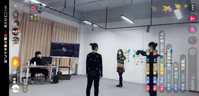 晚上7点30分,随着欢快的音乐响起,直播活动正式在抖音平台开始。场中,舞蹈专业员工的单人舞、双人舞、古典舞、现代舞轮番上阵,同学们舞姿优雅,潇洒。场边,动画专业师生利用数字技术将舞蹈者的动作实时同步到虚拟角色上,瞬间将现实世界与虚拟空间联系到一起,让真实的舞者以机器人、古代战士、卡通精灵等虚幻形象出现在屏幕上。