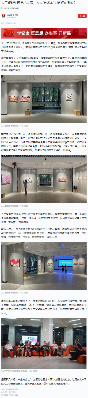 本网讯(通讯员付丹)6月20日,数媒系主任付丹老师受邀来到华中科技大学,参加了一场关于人工智能绘画艺术教学作品展览和教学研讨,相关内容学习强国武汉学习平台做了报道,详情如图:
