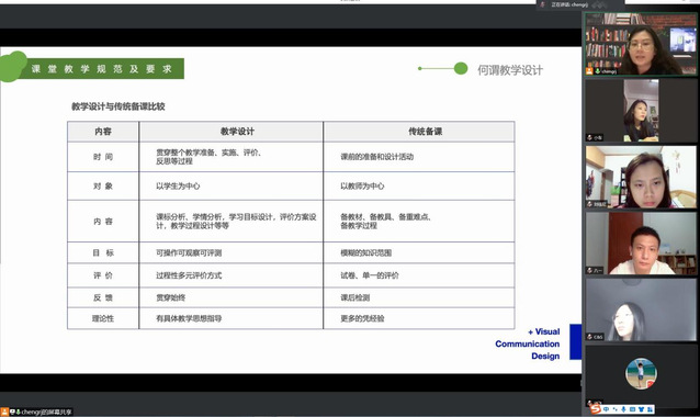 本网讯(通讯员谈飞)202291日晚上8点,视觉传达设计专业通过线上方式开展了对新进教师的教学培训工作,程蓉洁主任主持会议,程蓉洁主任对课堂教学的准备及要求做出细致讲解,谈飞副主任就教学档案的规范及要求做出具体指导。视觉传达设计专业安排副高职称以上教师一对一指导新进教师,帮助他们更快在教学科研上快速成长,更快的转换角色,更出色完成各项工作。