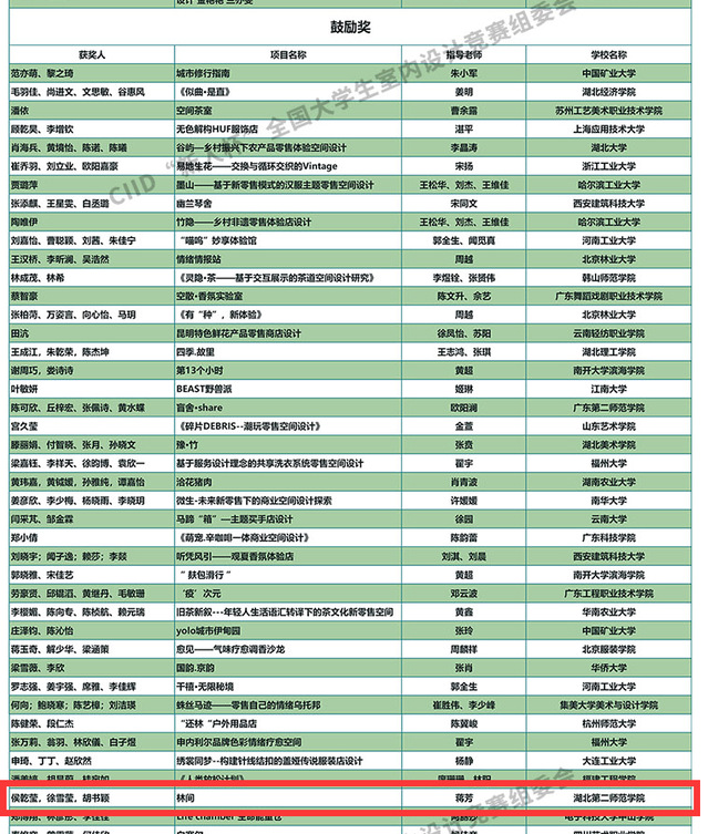 本网讯(通讯员秦杨)近日,由CIID举办的2022年第21届“新人杯”全国老员工室内设计竞赛结果揭晓,由环境设计专业19级员工侯乾莹、徐雪莹、胡书颖三位同学组队、蒋芳老师指导的作品《林间》获得鼓励奖一项的成绩。