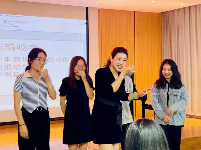 韦也纳老师首先与员工开展了一次互动——教同学们“吸气”,以此充分调动同学们的热情。韦也纳老师从箱子中拿出了空心薄荷糖和饼干。“糖果是空心的,从洞中吸气,跟着我做,先学会的同学有饼干吃”,同学们迫不及待地撕开包装开始学习。一部分同学直接吃进嘴里,“这位同学,不能直接吃完哦”,老师一个“无奈”的表情引得大家哄堂大笑,现场氛围顿时高涨。正戏开场,韦也纳老师从歌唱的风格、歌唱的不同形式,“如何唱好一首歌”三个板块来进行讲解,层层递进,深入浅出。在讲到第三个板块时,她强调:“要注重气息运用,节奏把控,准确咬字和专情演唱”。