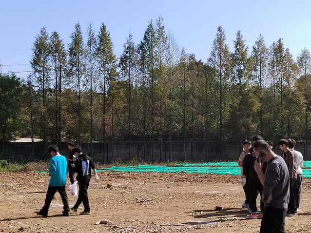 在同学们的共同努力下,校徽的基本框架已初具雏形,之后便是校徽内部的图案转折与“火炬”细节,与简单的外轮廓相比这一步骤难度大幅提升。但在同学们群策群力,集思广益之下,大家积极行动,首先定好校徽内部“火炬”的转折点,在空地上寻找到精确的转折点后再逐步精细线条弧度。最终成功确定好了“火炬”的形状,这也成为了此次任务最精彩的部分。