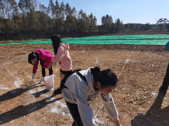 这次活动需要将二师校徽等比放大到空地上,校徽是二十风貌的展现,因此需要精准的等比例放大。在傅老师的指导下,同学们将校徽图案以二横五竖拆分成18个小块区域并且在转折处精准定点,大致确定后同学们自成小组负责本组所在区域。期间同学们配合默契,交流合作,这不仅仅彰显了艺院学子团结一体,脚踏实地,勇于担当的精神风貌,更展现出二师学子将所学运用于实际的实践能力。