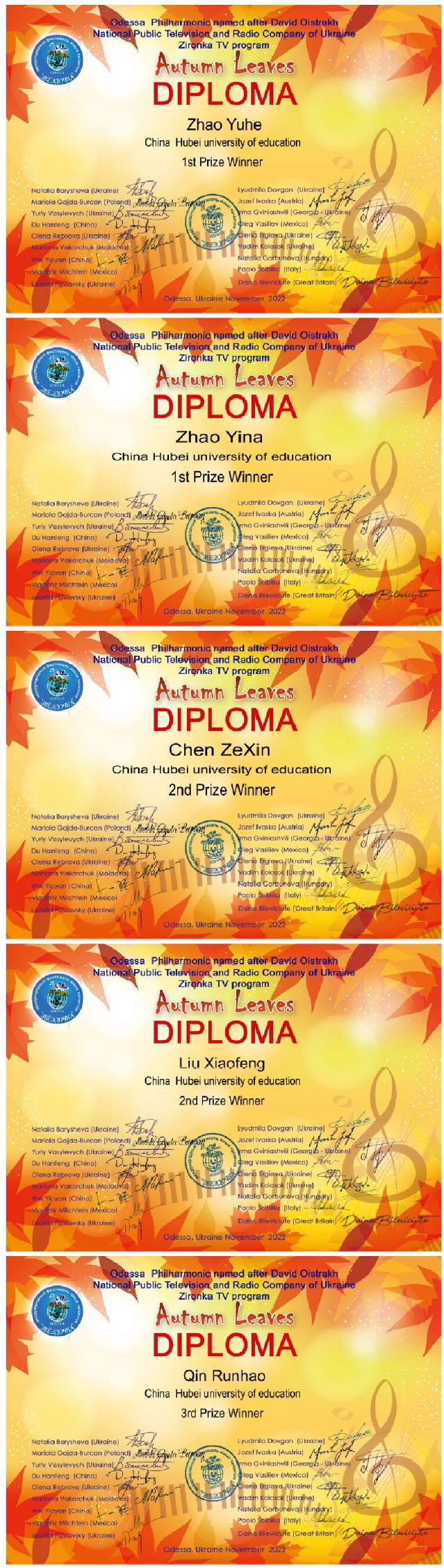 历年比赛共吸引全球超过30个国家的选手参赛,获奖者音乐会举办地包括敖德萨皇家歌剧院大厅、基辅菲拉莫尼音乐厅、基辅歌剧院、基辅歌剧院、利沃夫音乐厅、哈尔科夫菲拉莫尼国家大剧院等。据悉,今年的《星》青少年国际音乐比赛因为疫情等特殊原因,采取了线上提交演奏视频的方式进行。吸引了来自德国、英国、意大利、法国、波兰、澳大利亚、匈牙利、乌克兰、中国等国家和地区178名参赛者。评审团由来自英国、德国、中国、波兰、摩尔多瓦、乌克兰、墨西哥、澳大利亚、匈牙利、意大利的著名教授和教育家组成。音乐系员工参加该赛事,开阔了专业视野,提升了专业自信,激励了广老员工的专业学习热情和斗志。以下为获奖选手证书。