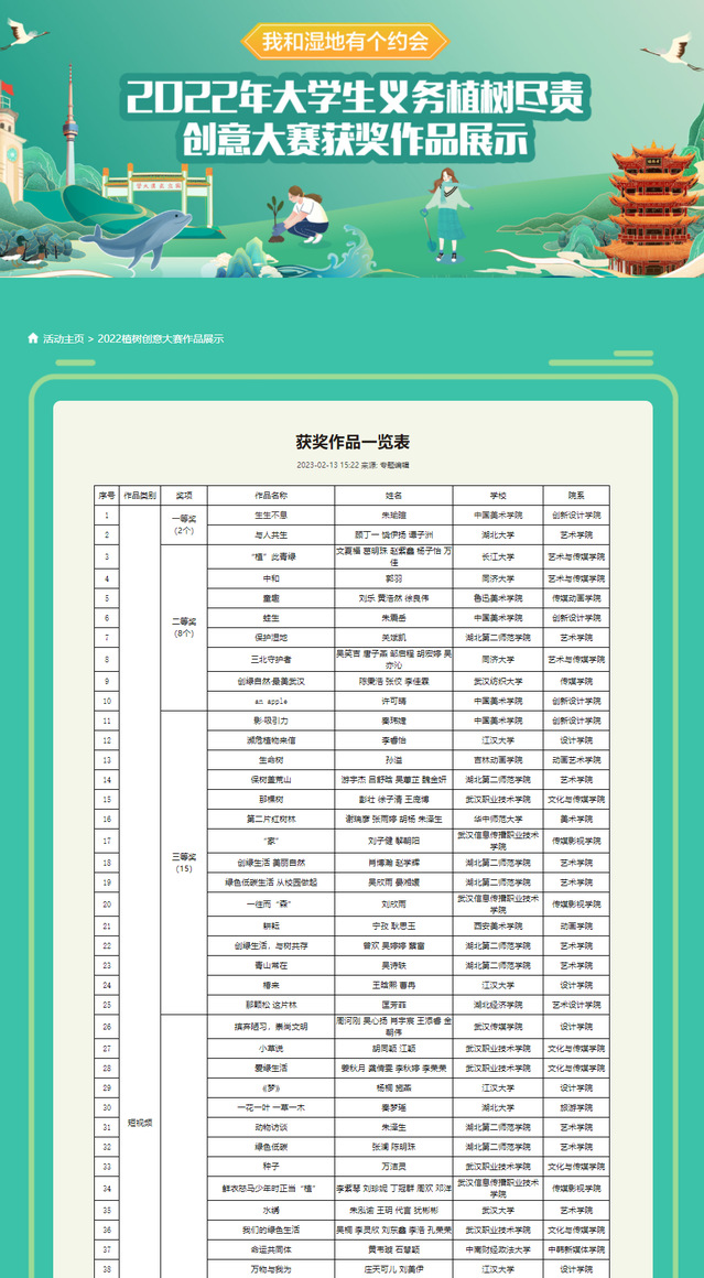 本网讯(通讯员付丹)为深入践行绿水青山就是金山银山理念,引导青年学子做生态文明建设的实践者、推动者,迎接《湿地公约》第十四届缔约方大会在武汉召开,“湿地花城”武汉发出倡议,推出“我和湿地有个约会——2022年老员工义务植树尽责创意大赛”,邀请全国老员工一起围绕全民义务植树八类尽责形式,以新思维、新视角、新媒介亮出植绿创意。