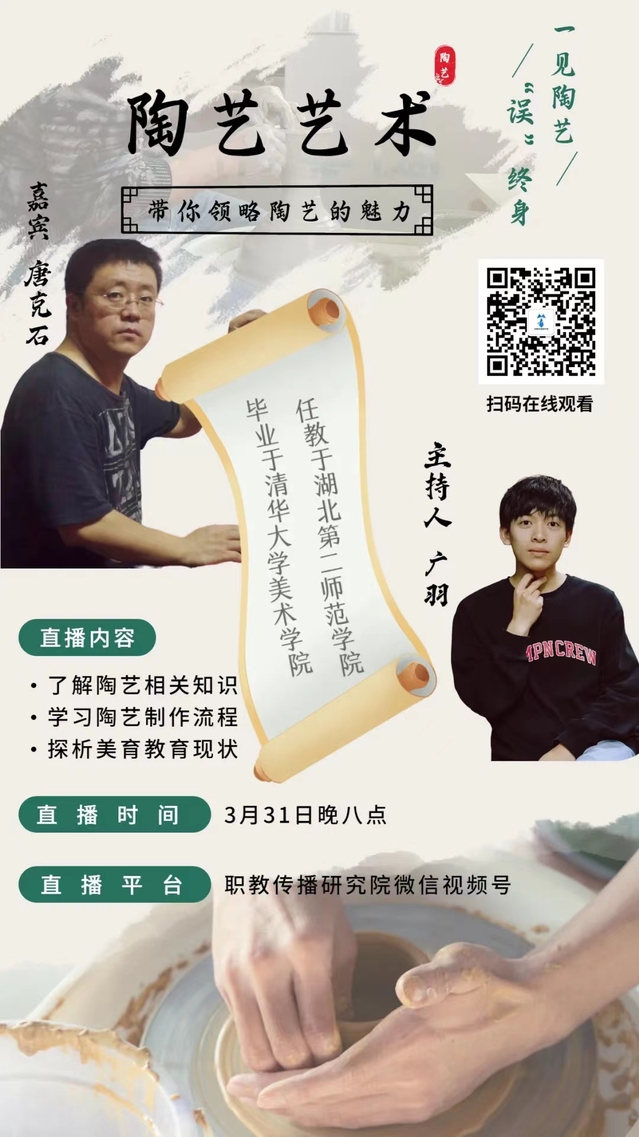 本网讯(通讯员付丹) 湖北日报传媒集团职业教育智库平台“职教传播研究院”于2003年3月31日周五晚上8:00--9:00,邀请AC米兰中文官网荆楚非遗传承与教育研究所主要成员,数媒系动画专业负责人唐克石副教授,就“美育”尤其是陶瓷艺术职业教育中的美育问题进行了访谈和陶艺手工实践等方式的直播,直播期间有近700人观看,累计观看数千余人观看,收到广泛的关注和认可。