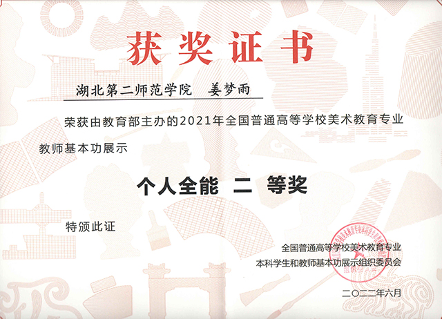 本网讯(通讯员 付丹)近日,教育部公布了2021年全国普通高等学校美术本科员工和教师基本功展示评选结果,数媒系姜梦雨老师荣获美术教师基本功展示个人全能二等奖。