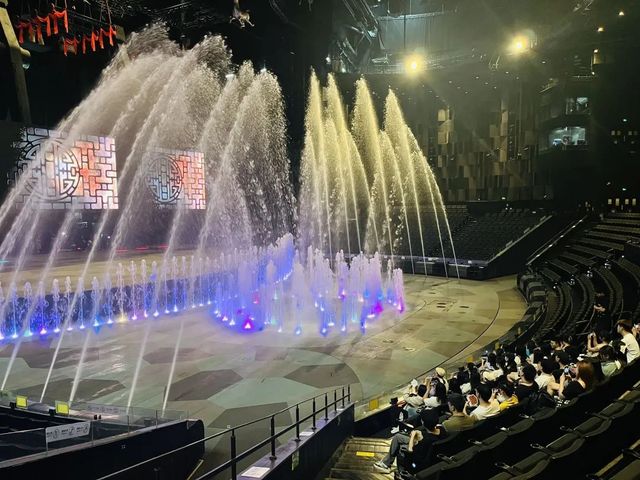 工作人员带领同学们来到了汉秀剧场的内场,在观众席上观看了舞台喷泉环节的表演,对能够瞬间干湿切换的舞台表示十分惊叹。工作人员仔细讲解了演出中制造“泡沫”和“沸腾”的效果的原由。