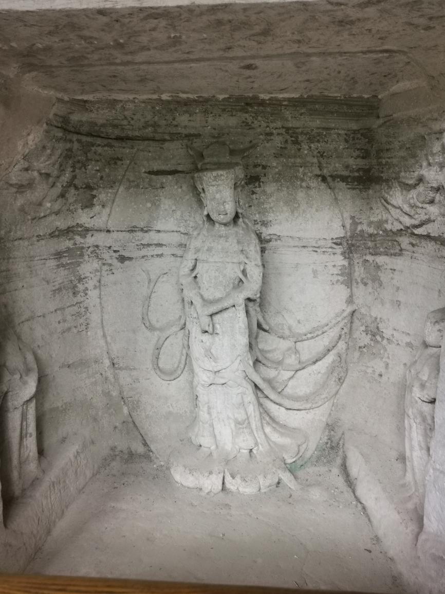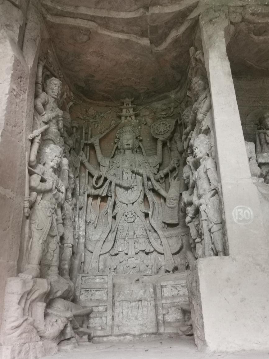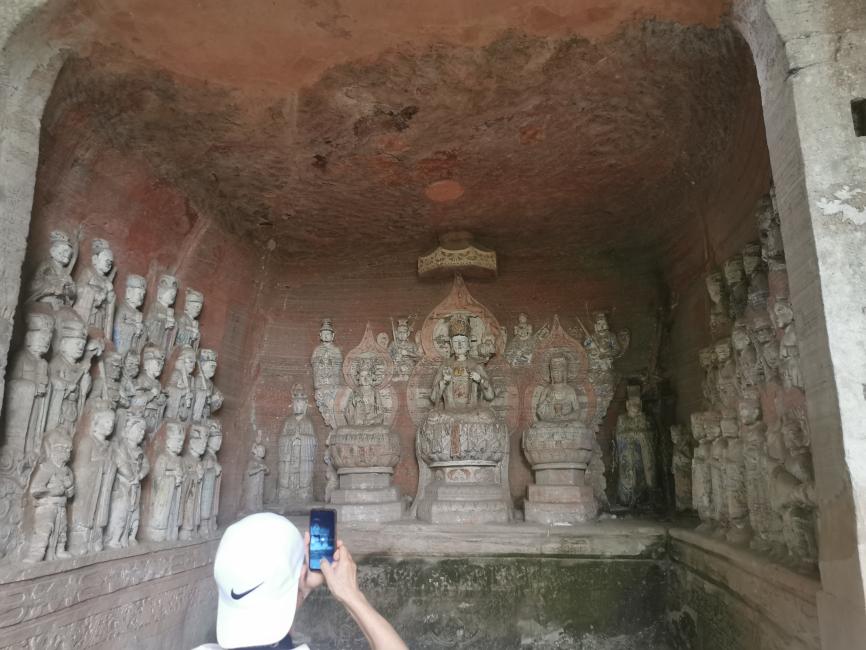 18日下午,我们来到了大足石刻的北山石刻,北山摩崖造像始刻于唐末,至南宋结束,和宝顶山石刻同为大足石刻中最大石刻,位于大足区城北2千米的北山上。以大佛湾为中心,遍及其四周的观音坡、营盘坡、佛耳岩、北塔寺共五处。长达500多米。岩高约7米,沿崖造像。从南到北形状若新月,龛窟如蜂房。造像5000余尊。造像细腻精美,技艺娴熟巧妙。除部分碑刻、塔幢和浅小龛窟残毁外,其余均保存完好。