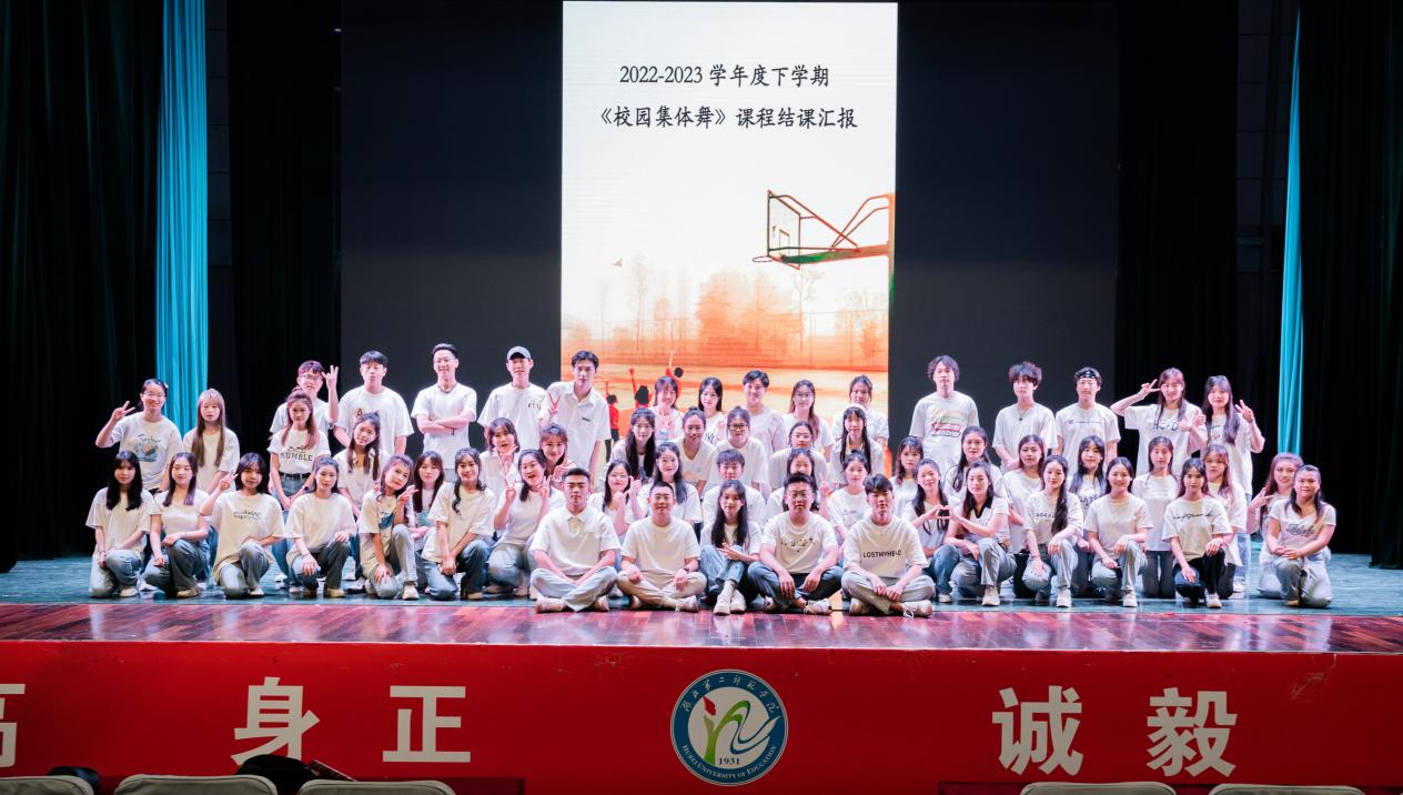 《校园集体舞》课程是音乐学专业的一门专业选修课,重在培养员工示范、自学、教学、指导能力,旨在提升老员工指导中小学艺术实践活动的综合实力。此课程的开设对于员工来说很有必要,尤其对于即将实习就业的员工来说非常受用。本次结课汇报演出中既有指定教学内容国家版校园集体舞《嘿,加油》、《童心舞动》,又包含了湖北省版校园集体舞《踏浪》、《童年》、《春晓》、《歌声与微笑》,还容纳了员工的自选校园集体舞与自学校园集体舞。舞台上的员工们在一曲曲童谣乐曲中通过双人与集体手拉手舞蹈合作的方式、自由自信快乐地表现着中小员工们的童真童趣。