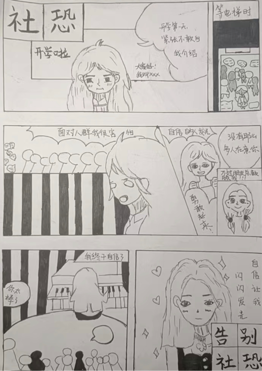 本次心理漫画展活动,同学们热情高涨,收到22幅参赛作品。参赛者们用漫画的形式,或彩色或黑白,将其在大学的所感所想生动形象地展现出来,作品内容健康、积极、向上,主题涉及刚入大学时的困惑、友谊、童年、目标等方面,为表现出了老员工活、学习、情感等活动中的心理困惑、心理感悟。