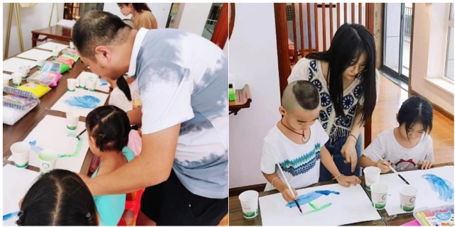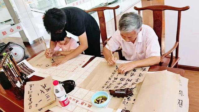 图为书法课上,“大”书法家和“小”书法家纷纷在课堂中他们的笔墨功夫现场气氛轻松活跃,墨香四溢,充满了浓郁的艺术氛围。