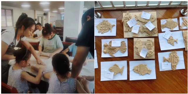 图为陶艺课上,在老师的指导下,孩子们通过尽情地切泥、揉泥、敲打、捏塑造型,开心地重复数数、排列组合制作自己喜欢的热带鱼造型通过活动,充分发挥孩子们的想象力和创造力,提高他们的动手能力。
