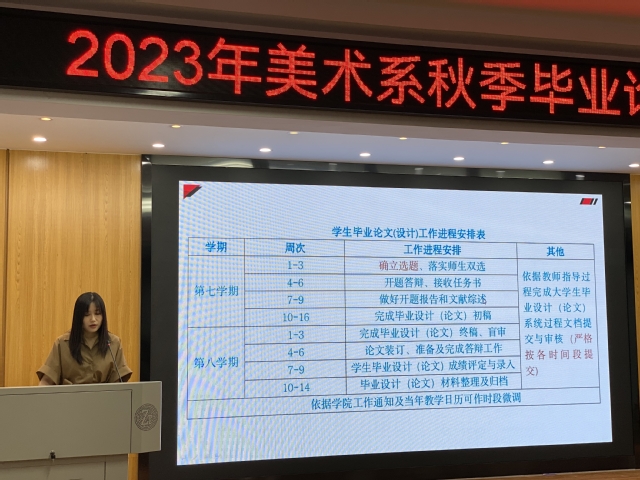 会议分成两个阶段。第一阶段由吴科老师对2023届毕业生论文(设计)要求进行讲解,着重阐述了员工毕业论文(设计)工作进程安排,以及相应的工作任务、论文撰写格式的要求,对论文文献综述的概述部分、正文部分、正文部分等进行详细讲解。