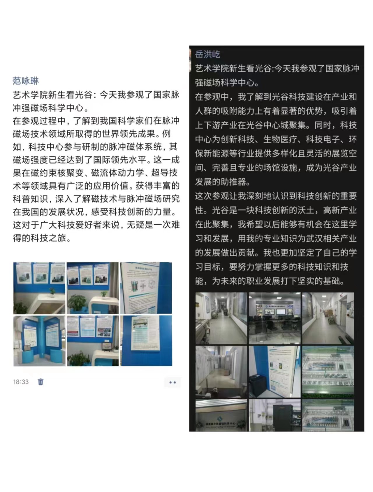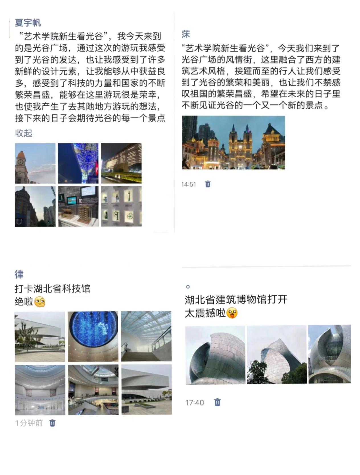游览过后同学们都自发的在朋友圈发表了自己的感想,并表示深刻地认识到科技创新的重要性,体会到科技创新的魅力,了解科技如何改变世界,如何推动社会进步,也让同学们对科技创新有了更深入的理解和认识,激发了大家对科技研究的兴趣和热情,为光谷的繁荣和发展贡献自己的一份力量。