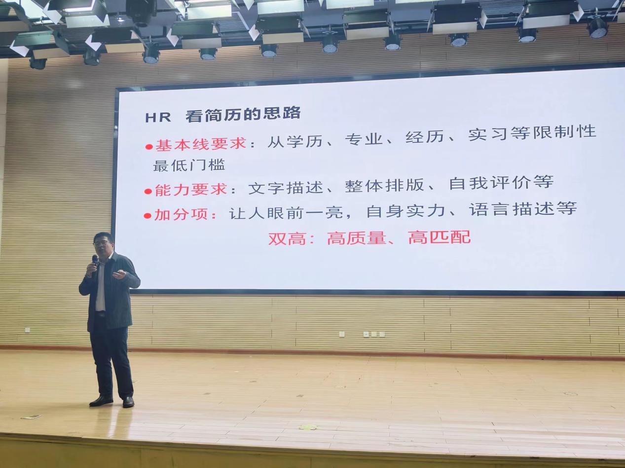 董永辉教授从简历的重要性优势如何说、单位从何而来岗位有供需、就业何处找求职渠道三个方面解决了同学们的困惑,并指出了知识、技能、综合素质和资源四方面的评估标准,向同学们提供了求职渠道。