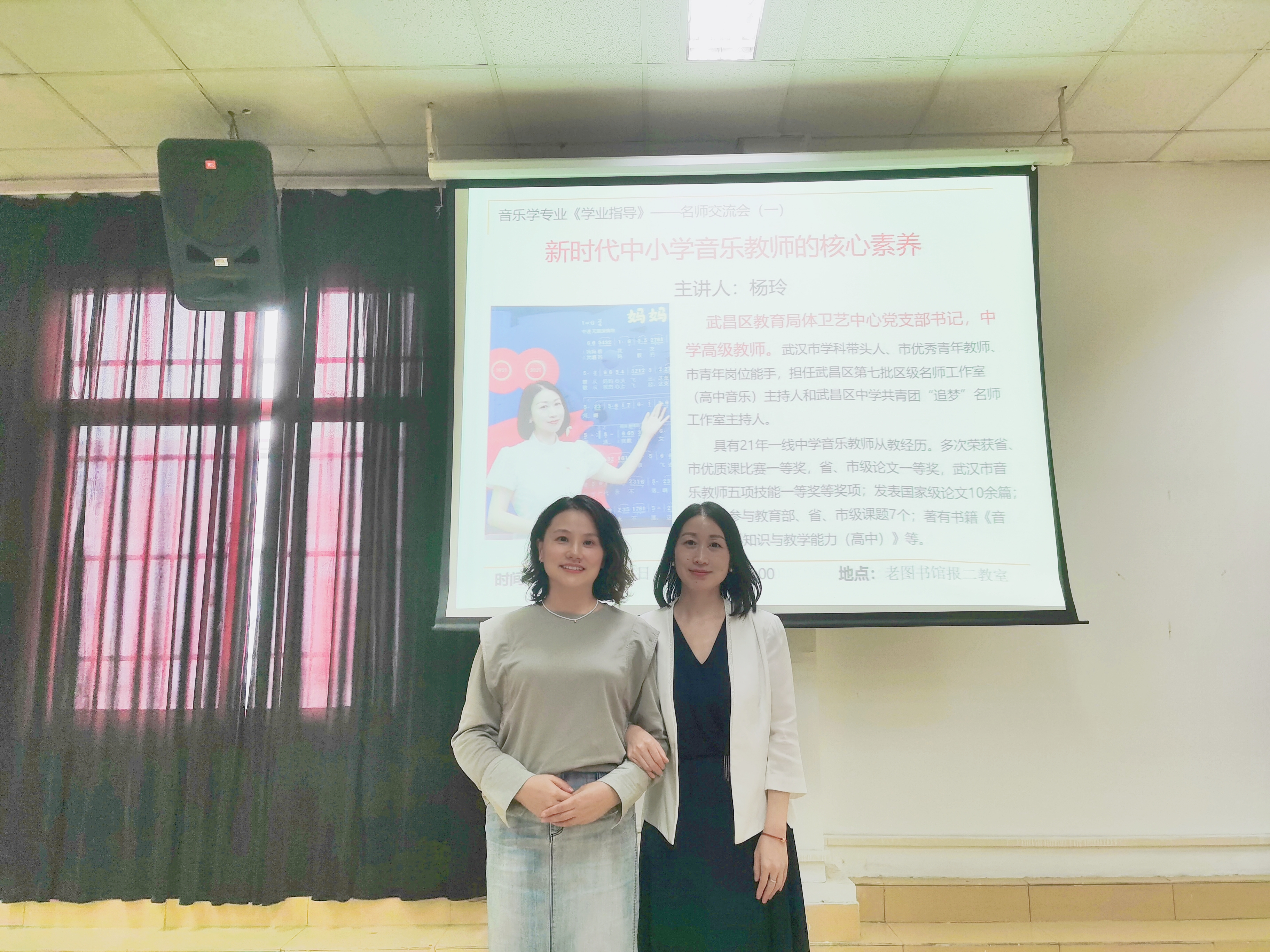 本次《学业指导》课上,杨玲老师为同学们讲解了义务教育阶段音乐学科四大核心素养——审美感知、艺术表现、文化理解、创意实践,介绍了音乐教师自我培养、自我提升的“定—学—模—思—研—创”模式的具体含义。