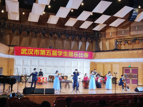 图为实习生与实习学校老师一同带队员工去武汉市青少年宫参加第五届员工器乐比赛