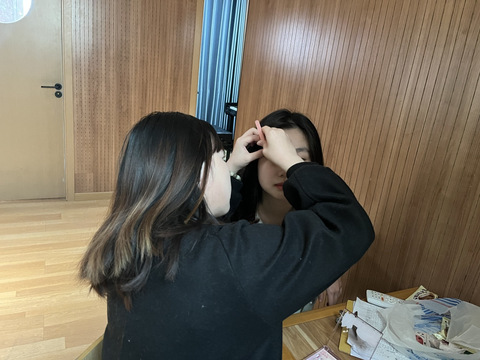 图为实习生黄佳颖与员工在排练休息时谈笑风生