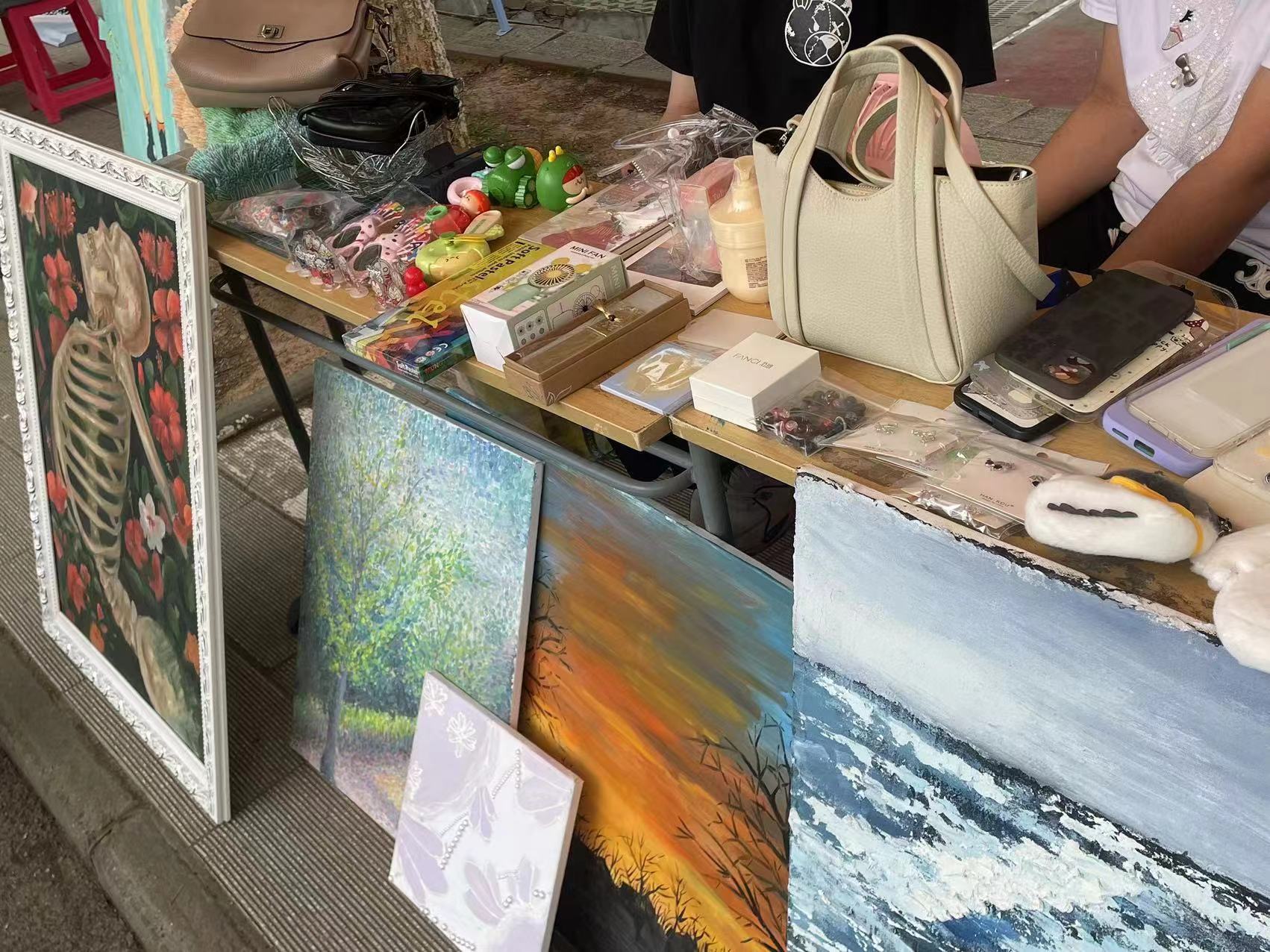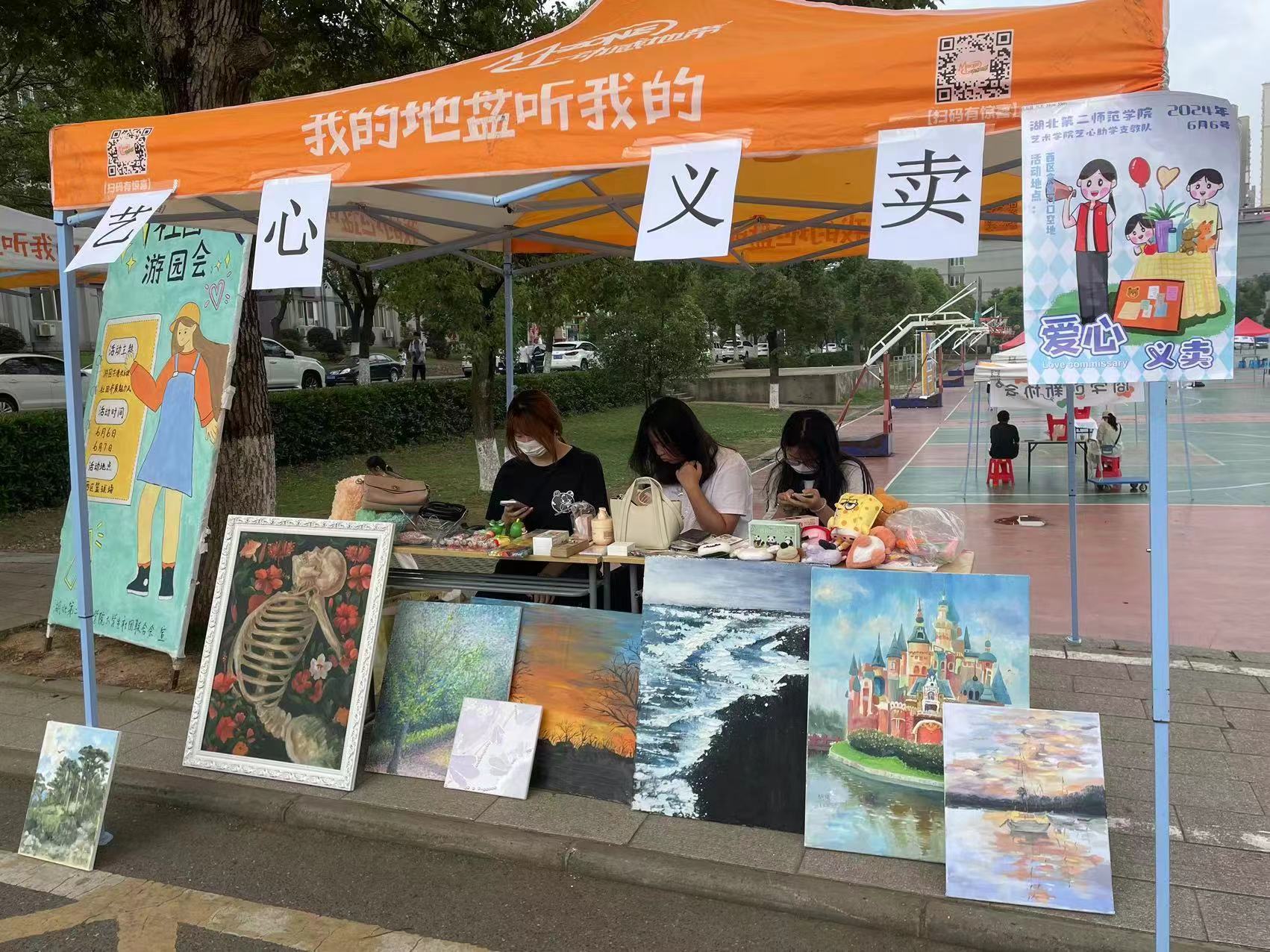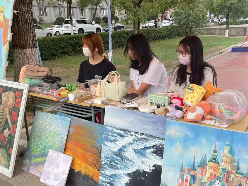 义工队员们化身摊主分工有致,齐心协力地经营着爱心摊位。爱心义卖活动不仅为师生提供了闲置物品的交流平台,也成为了展示学院特色和发挥创意的舞台,手绘画画、玩偶、闲置物品义卖等特色别具一格。