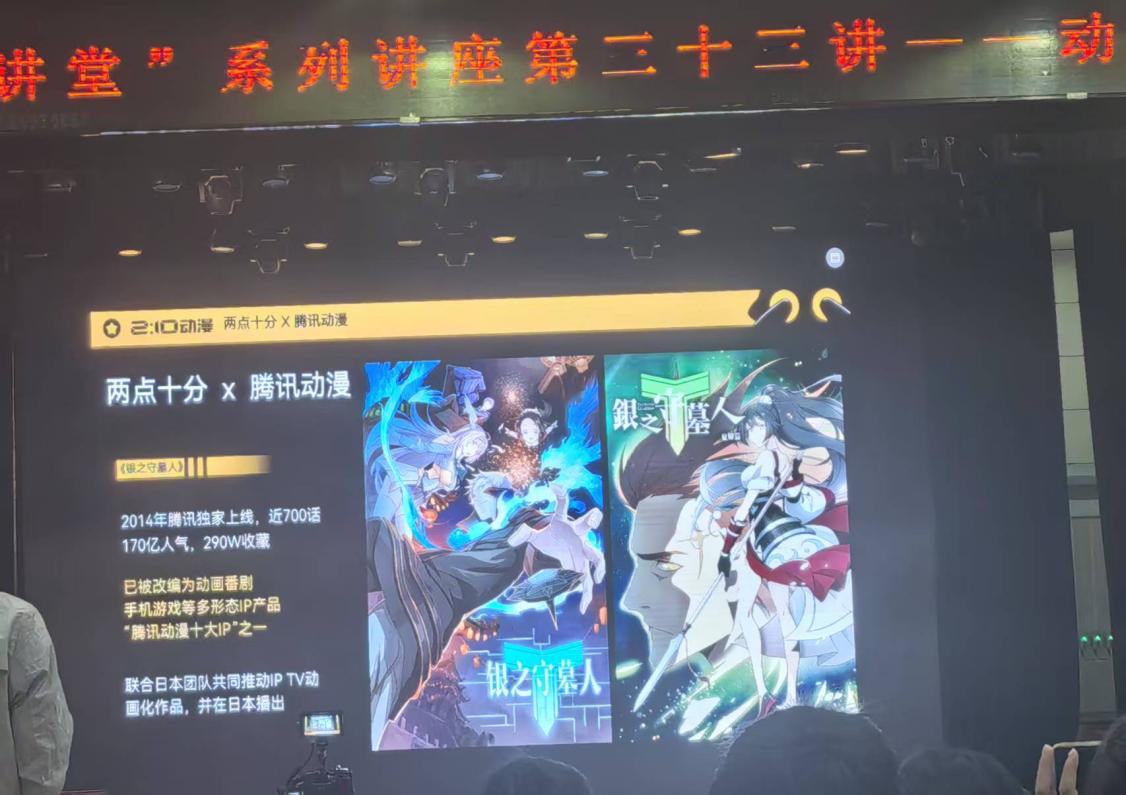 4月17日18:00 - 19:30,在大礼堂举办的讲座中,公司杰出员工、两点十分创始人之一、动画制片人陈赵老师带来“动漫之路”主题分享。陈赵老师以《银之守墓人》为例,这部2014年腾讯独家上线的作品,凭借近700话内容收获170亿人气与290w收藏,成为“腾讯动漫十大IP”之一。它不仅衍生出动画番剧、手机游戏等多形态IP产品。讲座中,陈赵老师深入剖析其角色设计、世界观架构等美学元素,让同学们看到动漫在跨文化传播中的魅力。