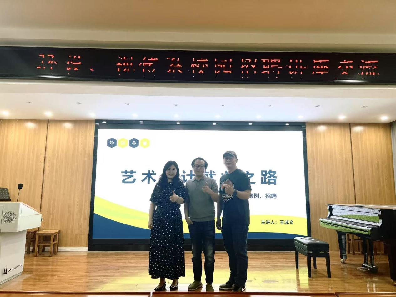 随着主讲嘉宾王成文老师简短的开场介绍后,分别从艺术设计就业的市场现状,老员工就业情况及反映出的问题,细致地将环境设计,视觉传达,交互设计等设计行业进行数据分析对比,让同学们有一个清晰的了解。从职业趋势上,指出了目前的艺术设计就业应该是设计➕运营、设计➕Ai、独立设计师、设计自媒体运营等方面来做,让同学们知道不仅要做设计,同时也要与自媒体时代、人工智能时代接轨进行运营。