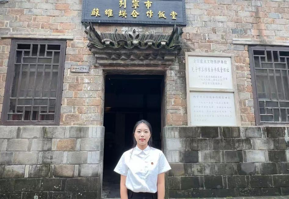 (图为讲解员刘思邑正在对列宁市苏维埃合作饭堂旧址进行红色宣讲)