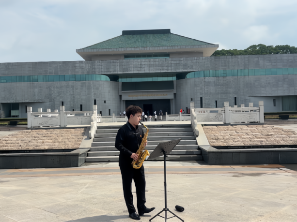 (图为乐器表演组余鼎文同学用萨克斯吹奏的《我的祖国》)