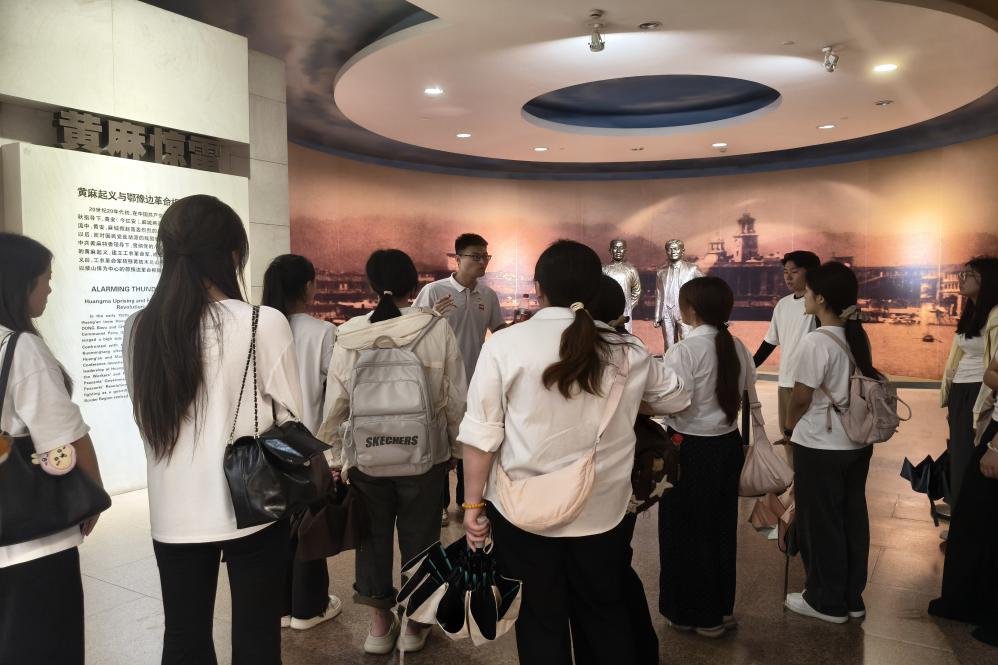 走进黄麻起义和鄂豫皖苏区革命历史纪念馆,泛黄的照片、珍贵的文物、复原的战斗场景,瞬间将众人带回那段烽火岁月。馆内以序厅大型雕塑《大别山雄风》开篇,通过《黄麻惊雷》等六个单元,展出丰富革命历史资料,并运用声、光、电等技术,生动展现鄂豫皖革命根据地的英雄业绩与精神内核,让师生们对革命历史有了更深刻的认识。与此同时,“艺心向党”志愿服务队的讲解员们,在各场馆深情讲述革命故事,传播红色文化;纪念园广场上,萨克斯演奏《我的祖国》、舞蹈《党旗飘扬的方向》轮番上演,以文艺形式表达对祖国的热爱与对党的忠诚。