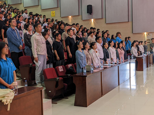 庄严的国歌旋律响彻礼堂,全场师生肃然起立,深情跟唱。在这激昂奋进的节奏中2025级新生开学典礼正式拉开序幕。