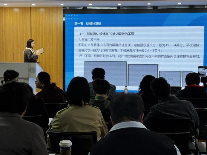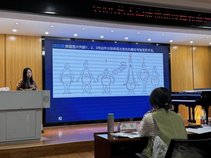 本次竞赛内容包括教学设计、课堂教学和教学反思三部分,四位青年教师在比赛前提交了教学设计,在现场依次展示了课堂教学和教学反思。刘佳尼老师以《UI界面设计》为主题,结合界面设计案例与互动演示,清晰呈现课程逻辑;姜梦雨老师借助作品片段展示与创作思路分享,生动的诠释了《动画短片创作II》课程的实践要点;寇琰老师以现有乐器辅助教学,通过乐理实例解析《基本乐理》课程知识要点。车璇老师的《中国工艺美术史》课程,结合文物特征,分析讲解了元代时期的瓷器工艺知识目标,强化课程的文化内涵传递。四位教师的展示均融入互动环节,课堂氛围活跃,教学形式各有巧思。
